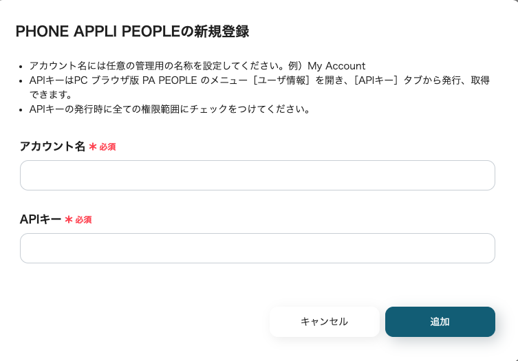 各項目を設定後、「追加」をクリックしてアプリ連携を完了します。