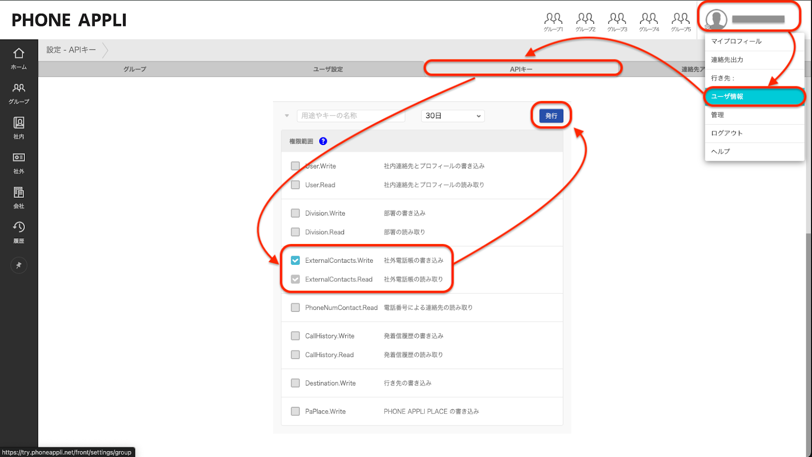 「APIキー」は、注釈と画像を参考にしながら、PHONE APPLI PEOPLEから発行したAPIキーを設定してください。