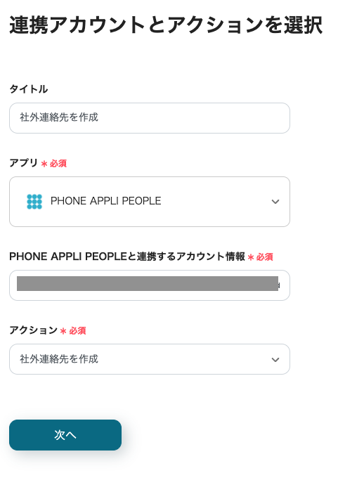 PHONE APPLI PEOPLEのアクションを設定します。「社外連絡先を作成」をクリックしてください。