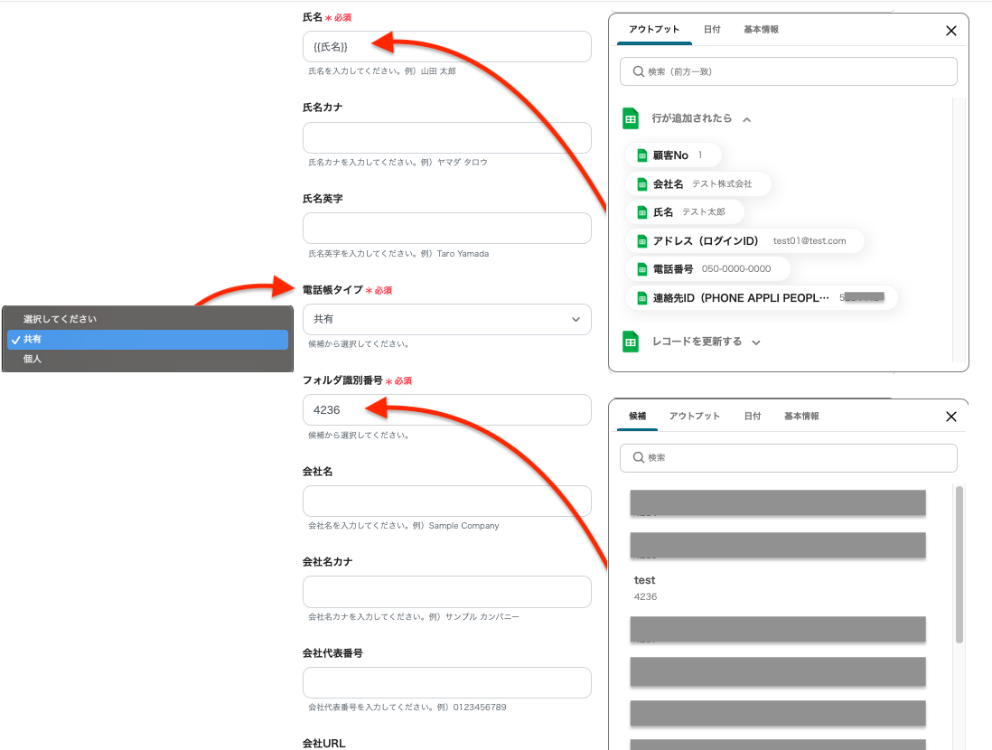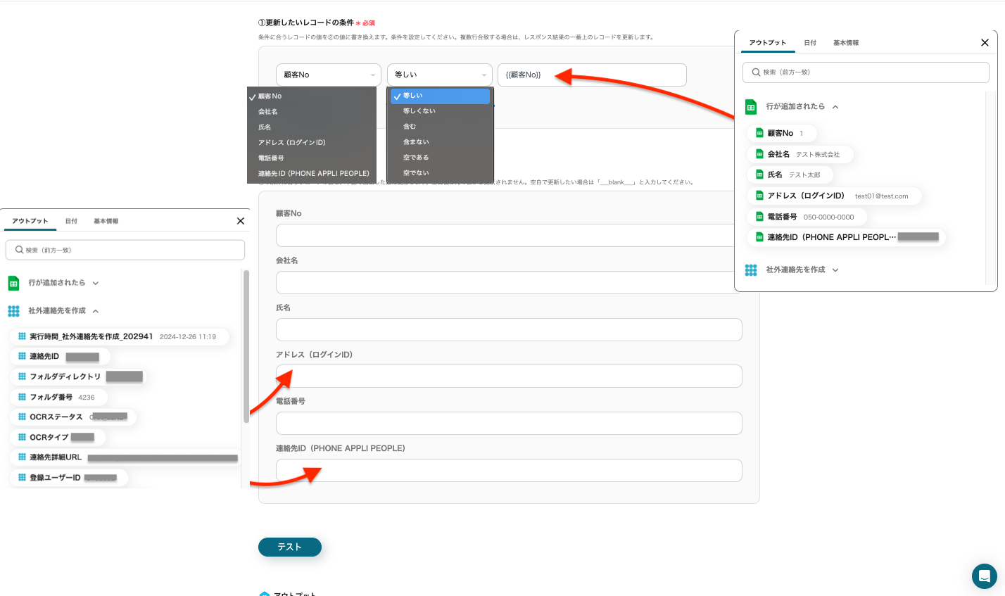 「②更新後のレコードの値」には、欄をクリックしPHONE APPLI PEOPLEで作成した値を選択してください。未入力の場合は、元の値から更新されません。