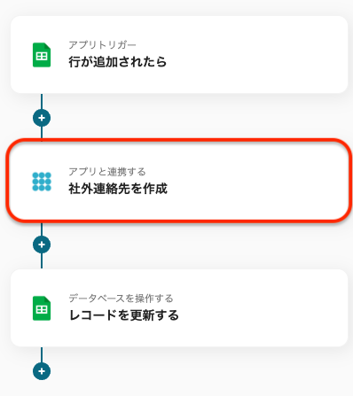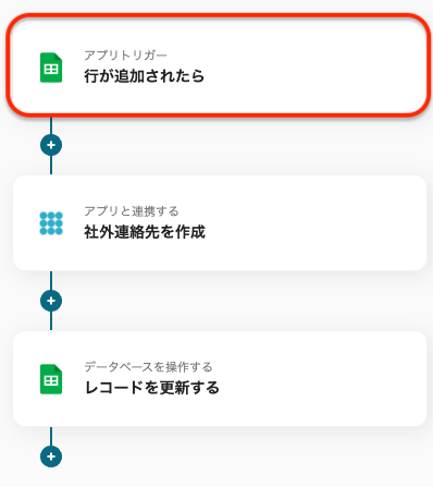 Google スプレッドシートの行が追加が登録されたことをGoogle スプレッドシートのAPIを利用して受け取り、PHONE APPLI PEOPLEの提供するAPIを用いてGoogle スプレッドシートのデータを基に、PHONE APPLI PEOPLEで社外連絡先を自動作成することで実現が可能です。