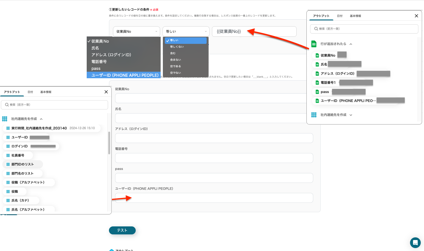 「①更新したいレコードの条件」を設定してください。今回は「スプレッドシートに保存されている従業員Noと連絡先を作成した従業員Noが等しい場合」という条件を設定しました。
