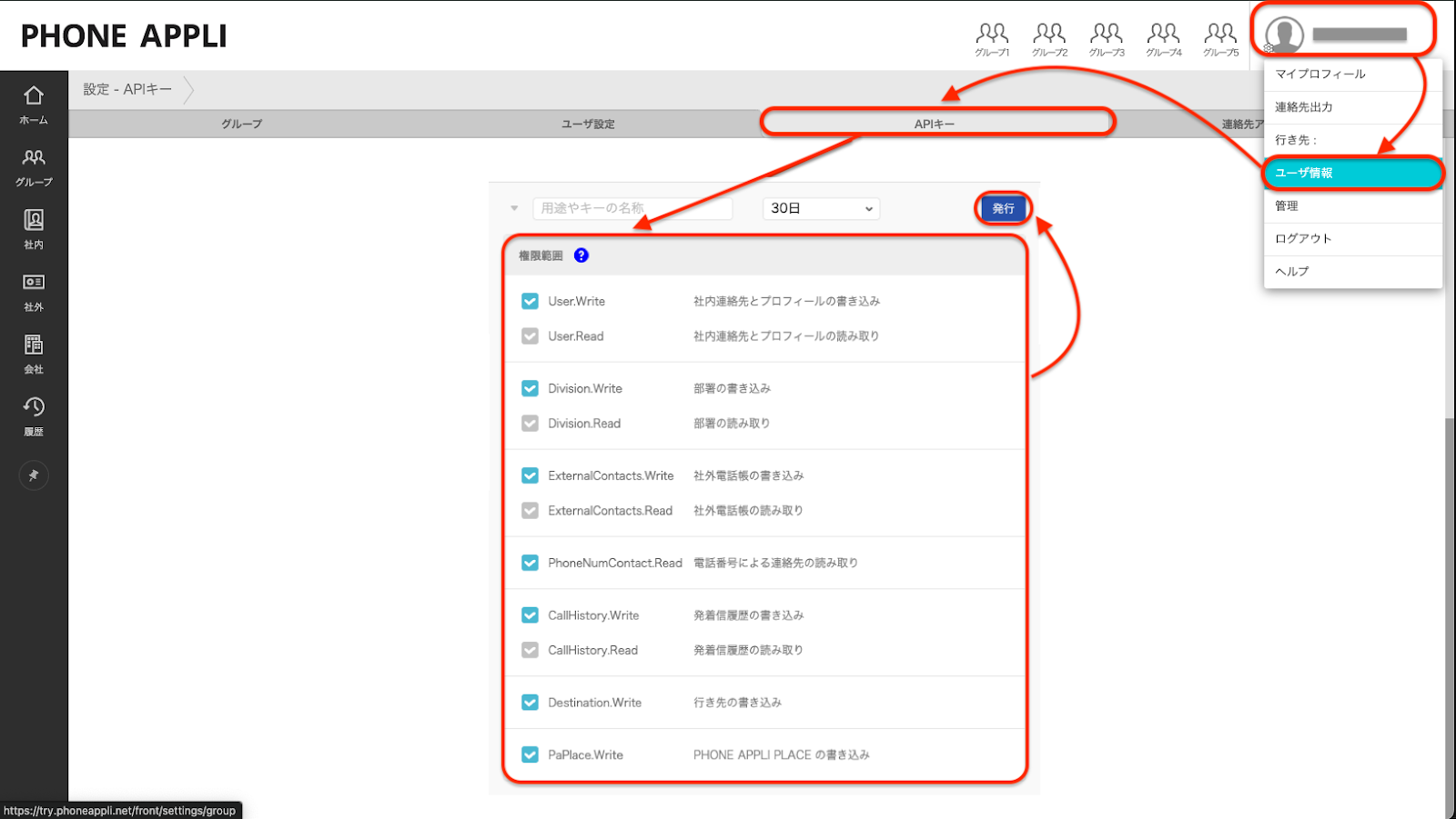 「APIキー」は、注釈と画像を参考に、PHONE APPLI PEOPLEから発行したAPIキーを設定してください。
