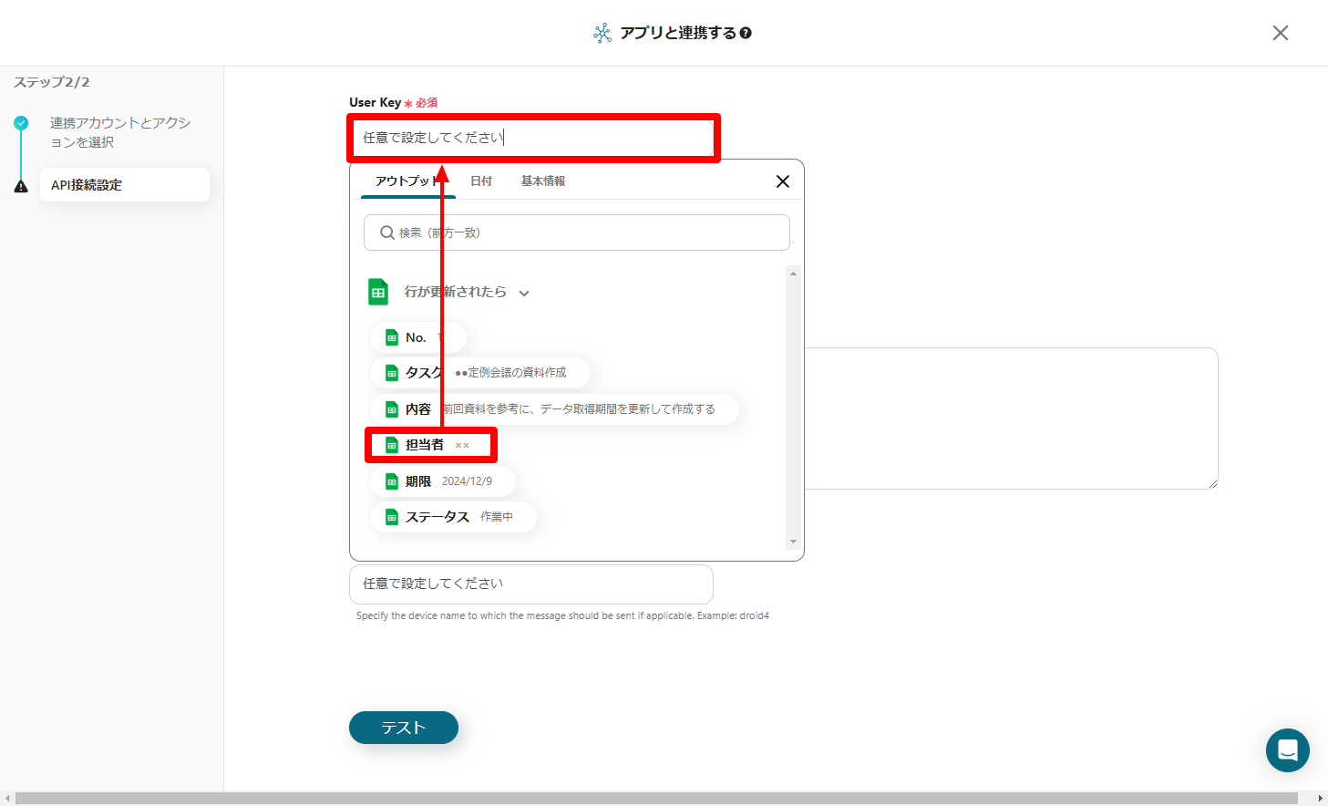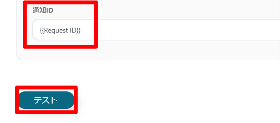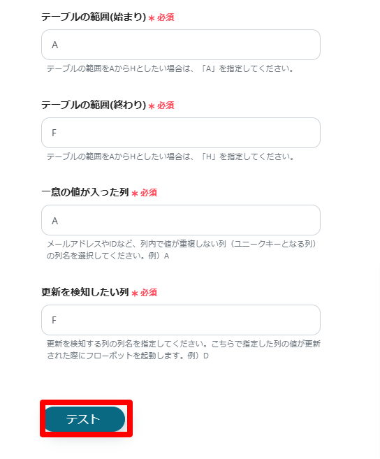 設定ができたら「テスト」をクリックして、Google スプレッドシートに反映されるか確認しましょう。