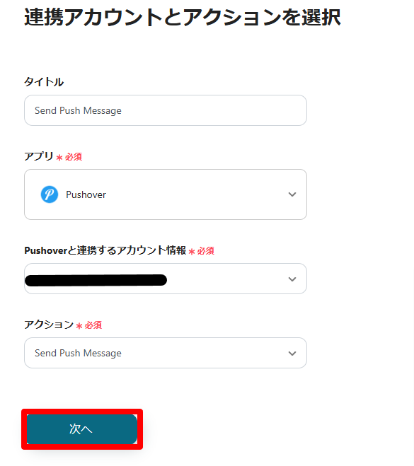 連携するアカウント情報に誤りがないかを確認し、必要項目を入力したら「次へ」をクリックします。