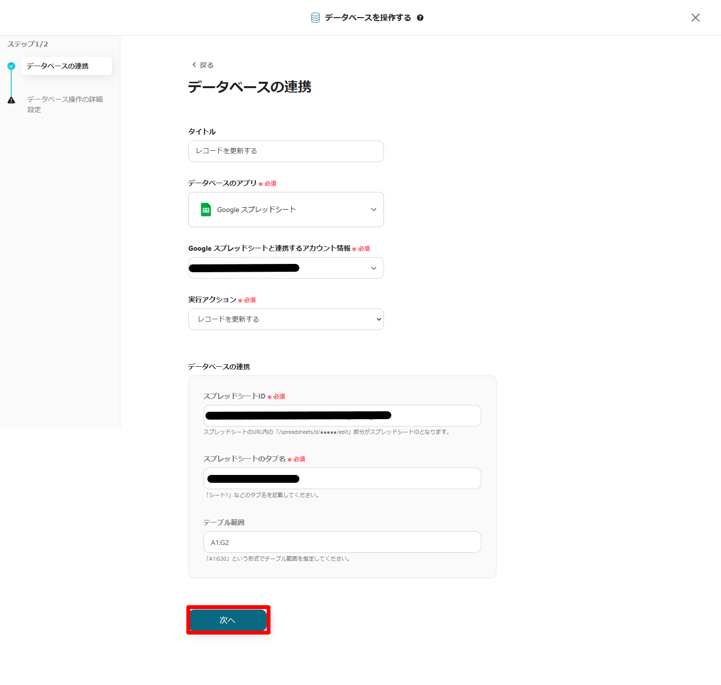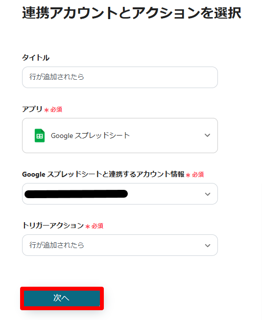 Google スプレッドシートに自動で更新するアクションを設定します。