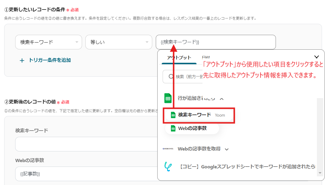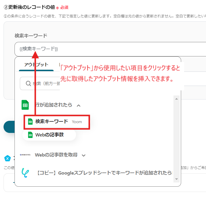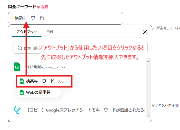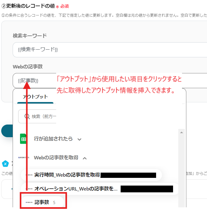 例えば、新規取引先一覧のスプレッドシートを選択すれば、新規取引先が追加されるたびに、該当するWeb記事の記事数を取得できます。