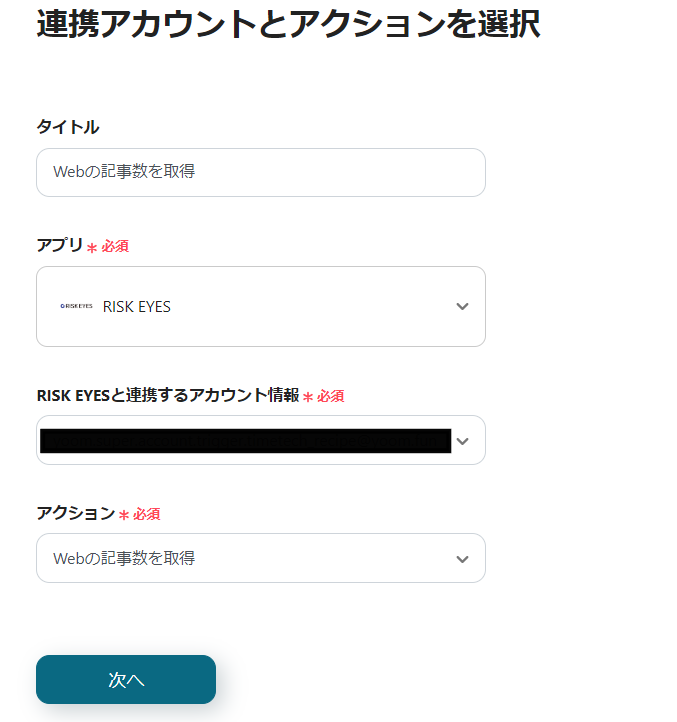 7) アクションは「Webの記事数を取得」を選択し、「次へ」をクリックします。