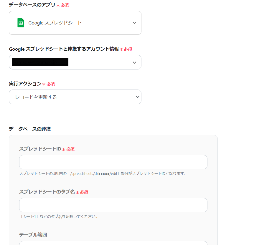 10)アクションは「レコードを更新する」を選択して、必須項目を入力します。