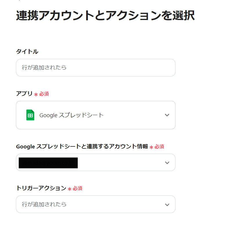 4) アクションは「行が追加されたら」を選択して、「次へ」をクリックします。
