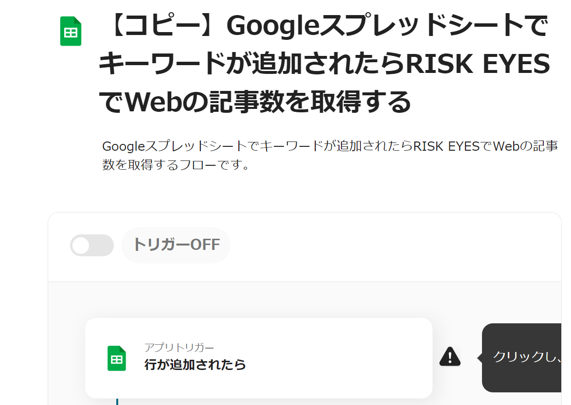 今回は、【Googleスプレッドシートでキーワードが追加されたらRISK EYESでWebの記事数を取得する】というフローを作成します。