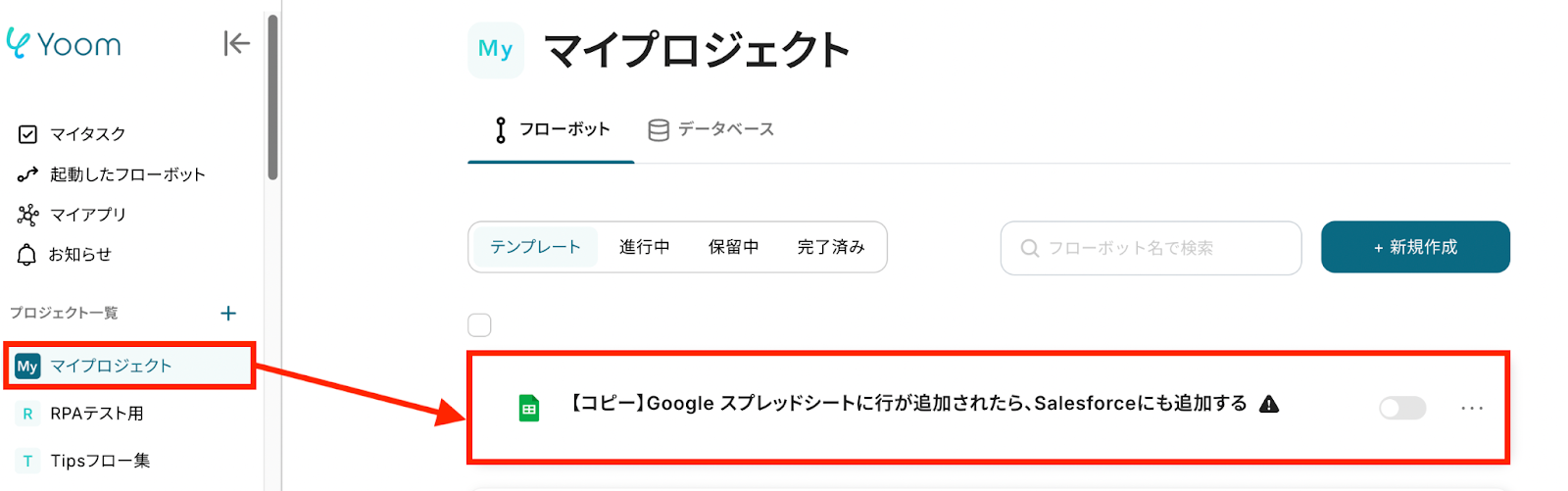 左側にあるメニューの「マイプロジェクト」から、コピーしたテンプレートを開きます。