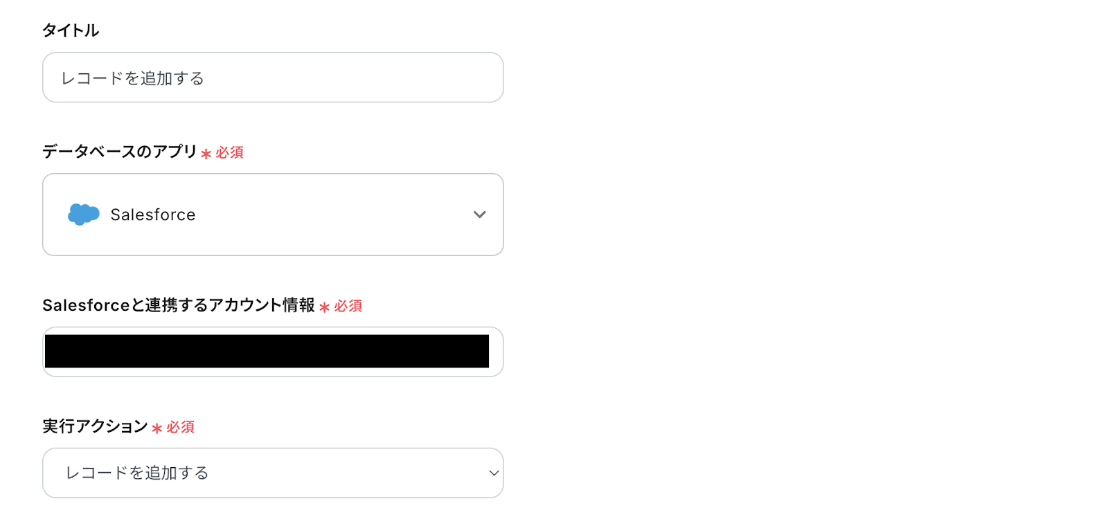 必要箇所を入力していきます。 「タイトル」:必要に応じて変更可能 「Salesforceと連携するアカウント情報」:合っているか確認 「実行アクション」:「レコードを追加する」を選択