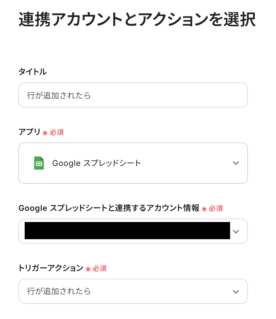 必要箇所を入力していきましょう。 「タイトル」:必要に応じて変更可能 「Google スプレッドシートと連携するアカウント情報」:合っているか確認 「トリガーアクション」:「行が追加されたら」を選択