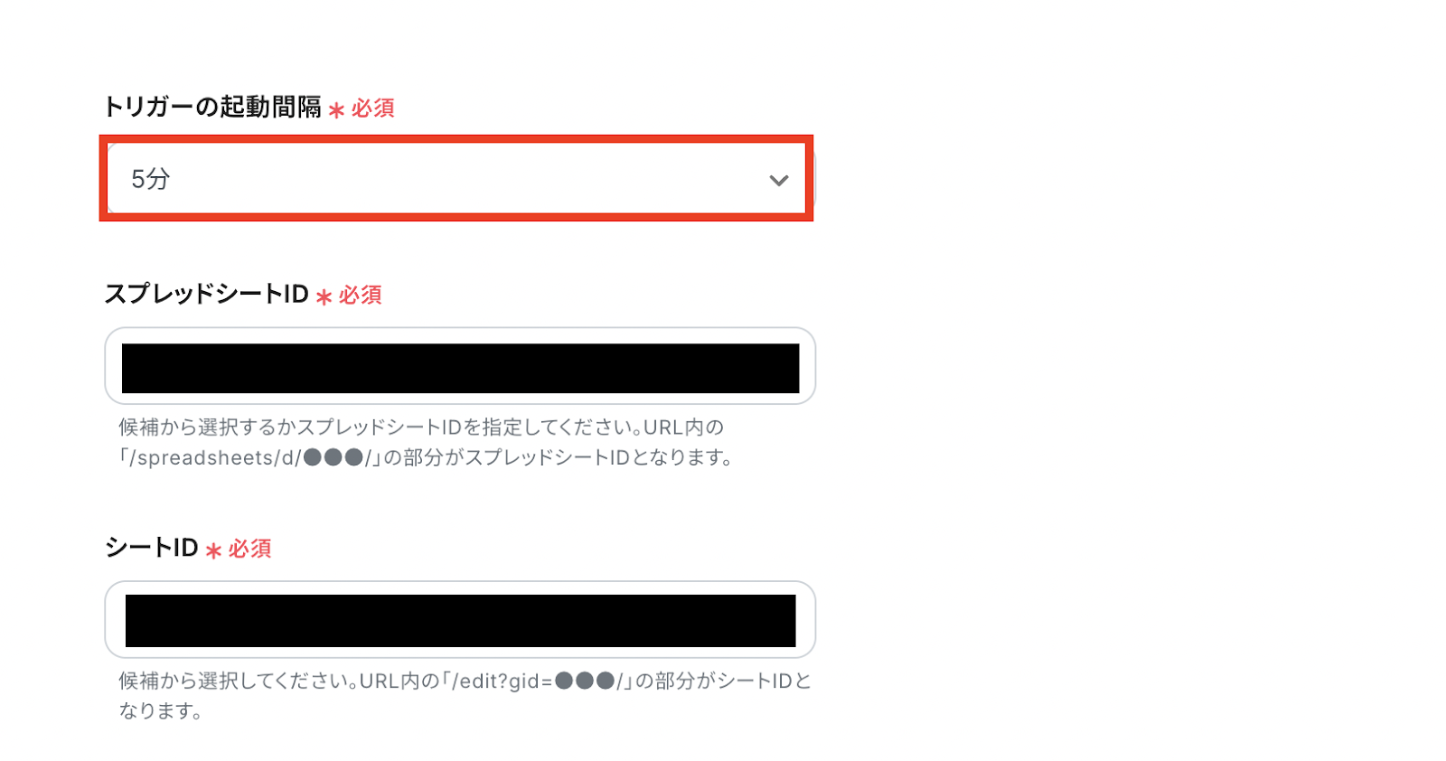 次に「スプレッドシートID」を入力します。 入力欄をクリックすると、Google スプレッドシートの候補が表示されます。 その中から選ぶと簡単に入力ができます!
