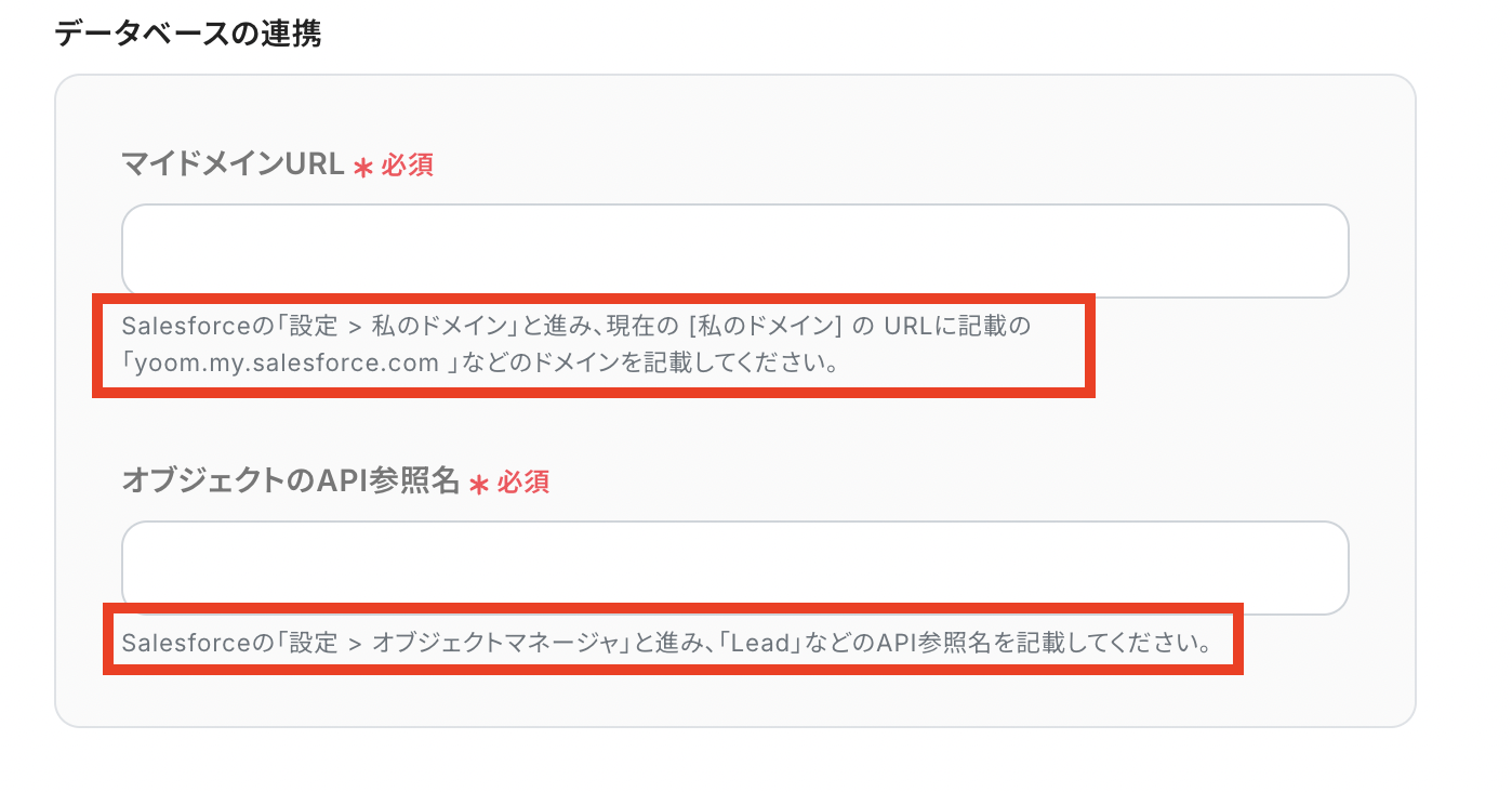 次に「データベースの連携」をします。 赤枠の注釈を確認しながら、設定を行いましょう。 「オブジェクトのAPI参照名」は、入力欄をクリックすると候補からも選択できます!