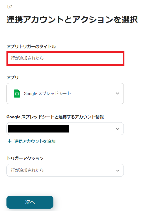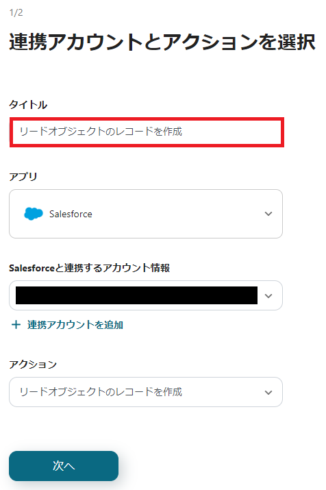 2.「連携アカウントとアクションを選択」の設定をします。 タイトルを必要に応じて変更し、「次へ」をクリックしてください。