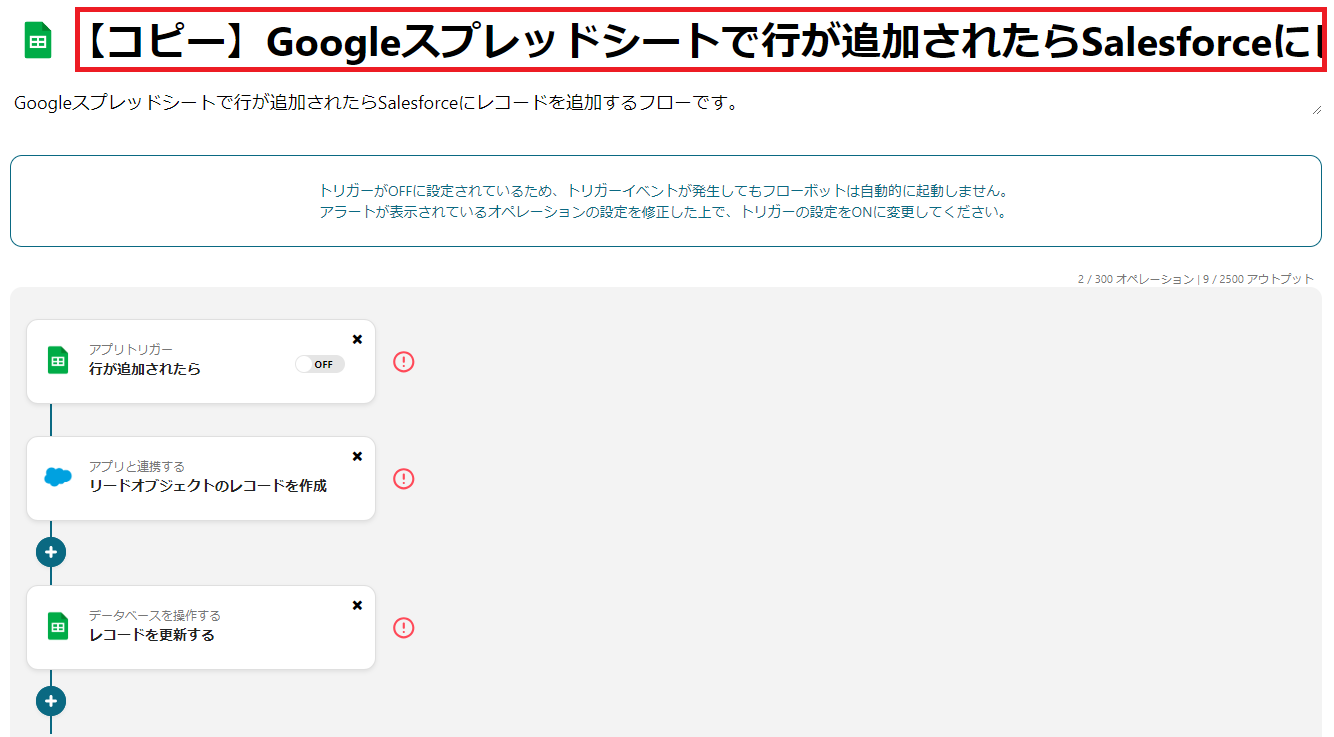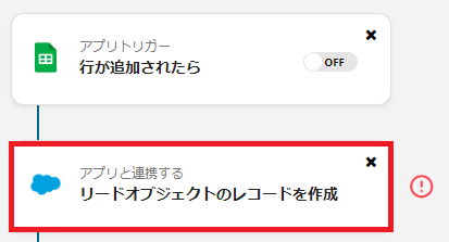 Googleスプレッドシートのトリガー設定で、監視対象としたいスプレッドシートおよびシートを任意で指定してください。 Salesforceにレコードを追加するオペレーションでは、Googleスプレッドシートのどの列の情報を、Salesforceのどの項目に追加するかを任意で設定してください。 ■注意事項
