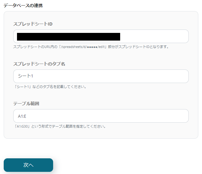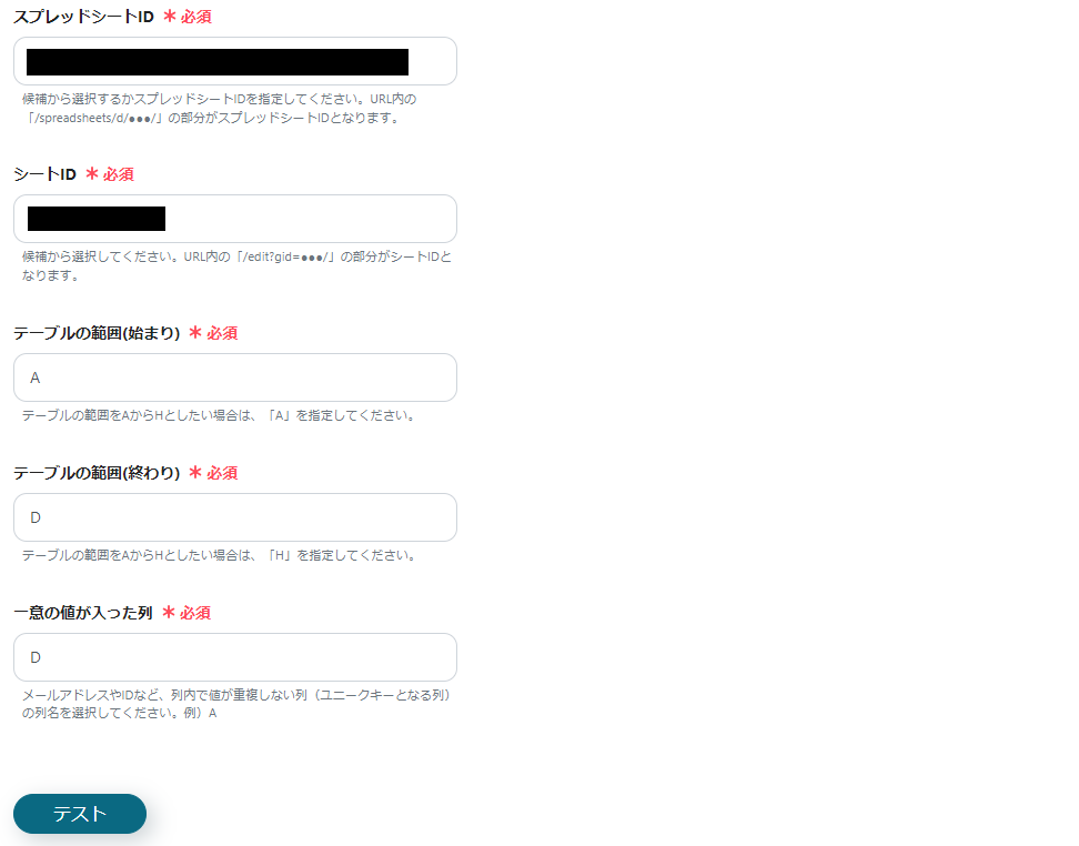 スプレッドシートID~更新を検知したい列の各項目:対象とするシートのIDや範囲を選択・入力してください。 ※下図は入力例です。