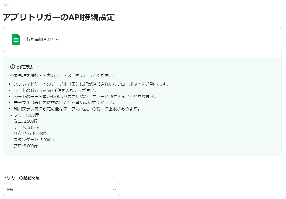 トリガーの起動間隔:任意の時間を選択してください。 ※トリガーは5分、10分、15分、30分、60分の間隔で起動間隔を選択できます。プラン によって最短の起動間隔が異なるので、ご注意ください。