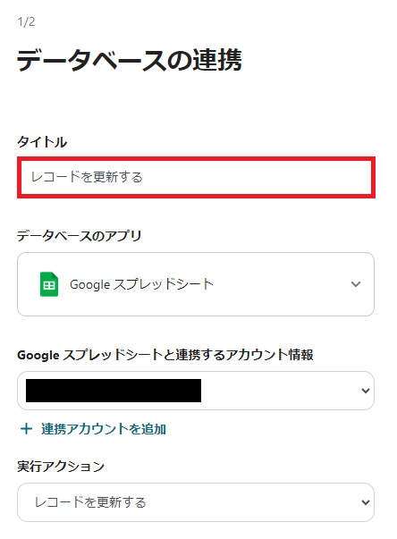 2.「連携アカウントとアクションを選択」の設定をします。 ・タイトル:必要に応じて変更してください。