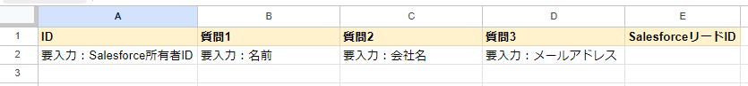 1.リード情報を管理するGoogle スプレッドシートのファイルに、SalesforceのレコードIDを入力する列を作成しておいてください。下図は一例です。