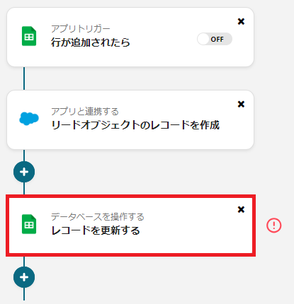 Googleスプレッドシートで行が更新された際に、その内容をSalesforceの既存レコードに自動で反映するフローです。 この連携により、手作業によるSalesforceへのデータ入力・転記作業がなくなり、データの一元管理が可能になります 。 また、常に最新かつ正確な顧客・リード情報がSalesforceに反映され、入力ミスによるヒューマンエラーを防ぎ、営業やマーケティング活動の効率アップに期待できる でしょう。