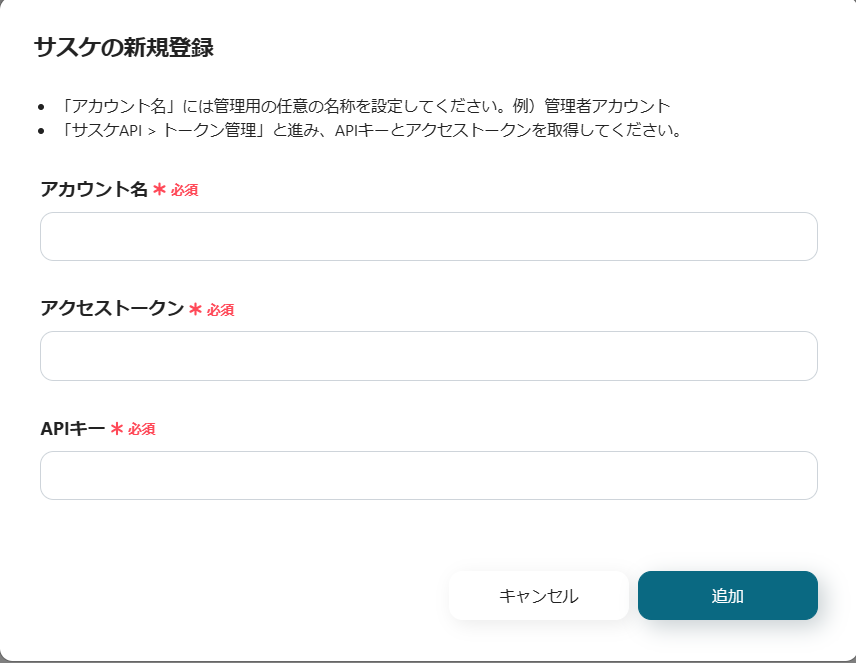 ・サスケは、アプリで取得した「アカウント名、アクセストークン、APIキー」を入力し、新規登録を行います。