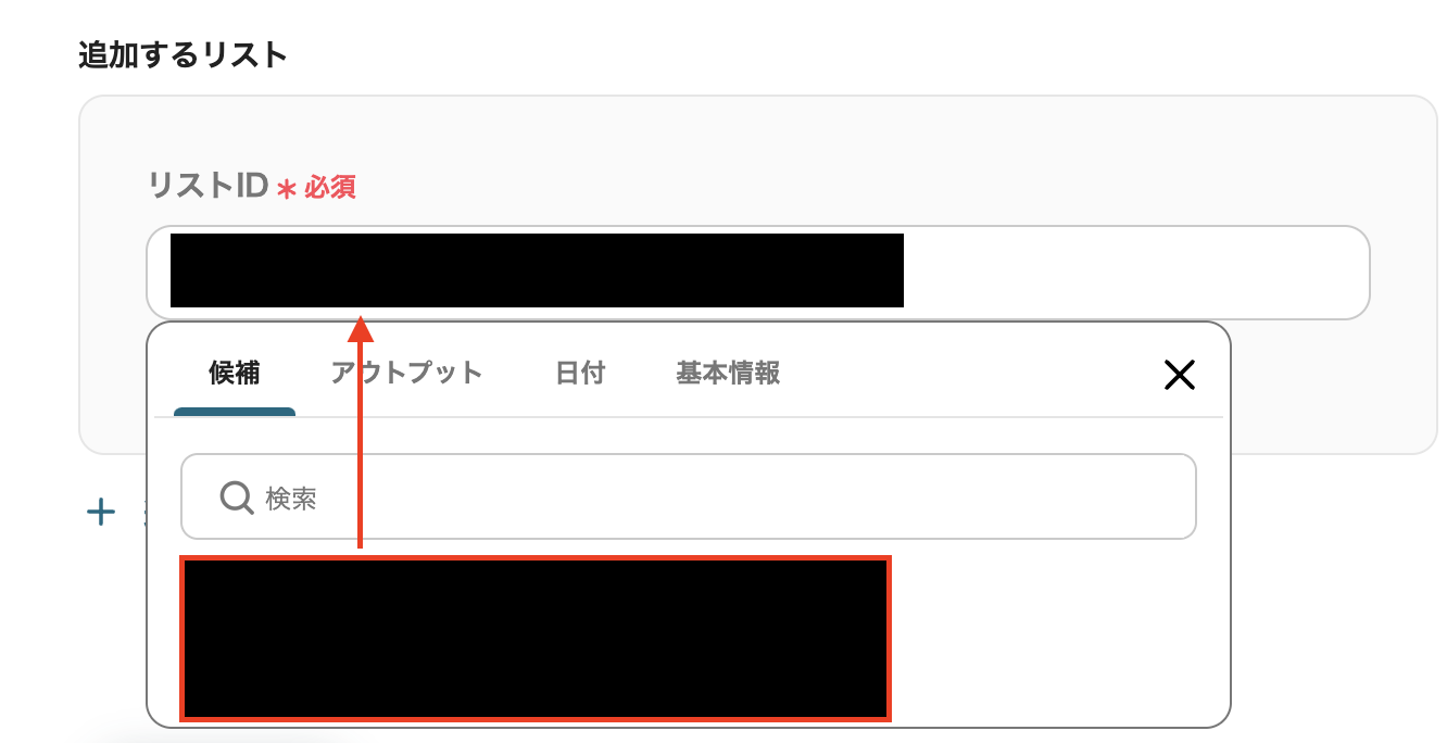 (4)「追加するリスト」部分は、前ステップから取得した情報を「候補」として展開できますのでこちらも活用しましょう。