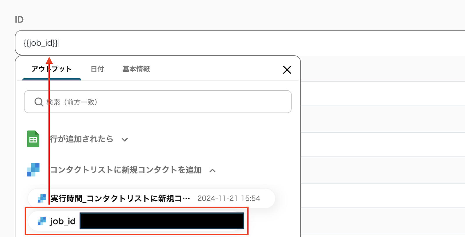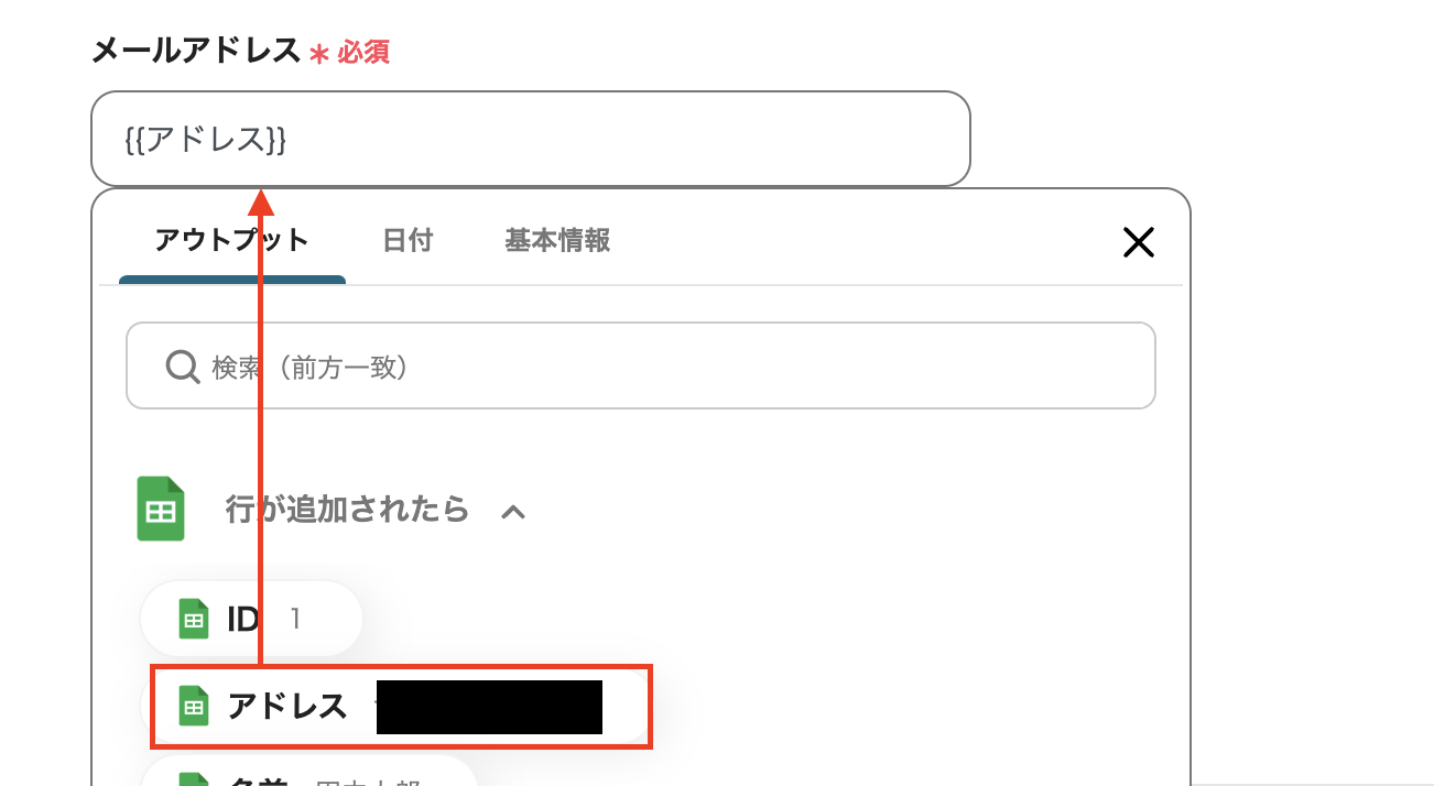 例として、下記は前ステップから取得したアウトプット【アドレス】の情報を引用したものです。