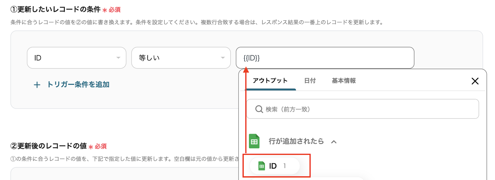 以下は例として、「①更新したいレコードの条件」へ、更新したいレコードに『ID』を指定し、条件を『等しい』、条件と一致する情報を『ID』(アウトプット活用)と設定したものです。