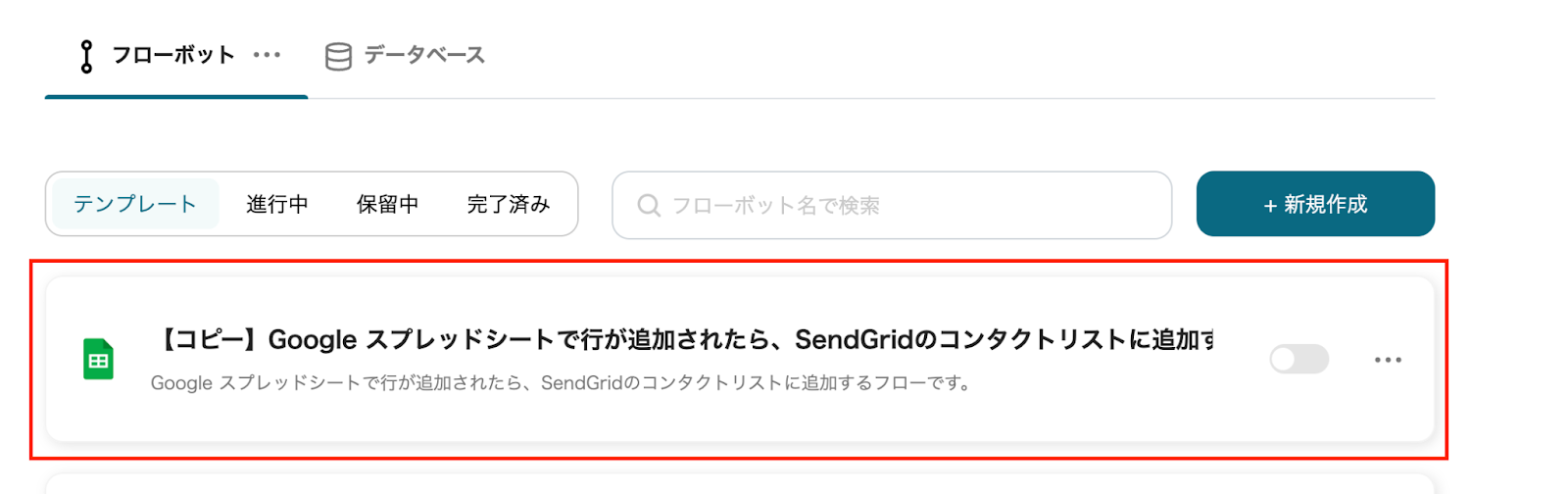 では、「Google スプレッドシートで行が追加されたら、SendGridのコンタクトリストに追加する」のテンプレートを使ったフローボットを作成していきましょう。