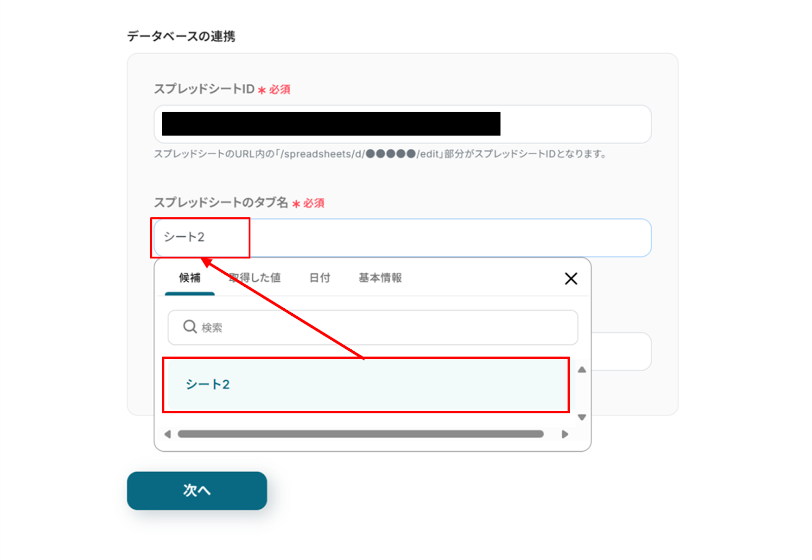 下へ進み、スプレッドシートID、スプレッドシートのタブ名、テーブル範囲を入力します。