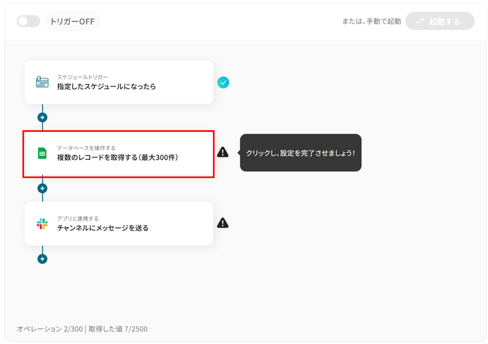 ・Googleスプレッドシートのレコード取得は最大10件のため、10件以上取得する場合、「同じ処理を繰り返す」オペレーションが必要となります。