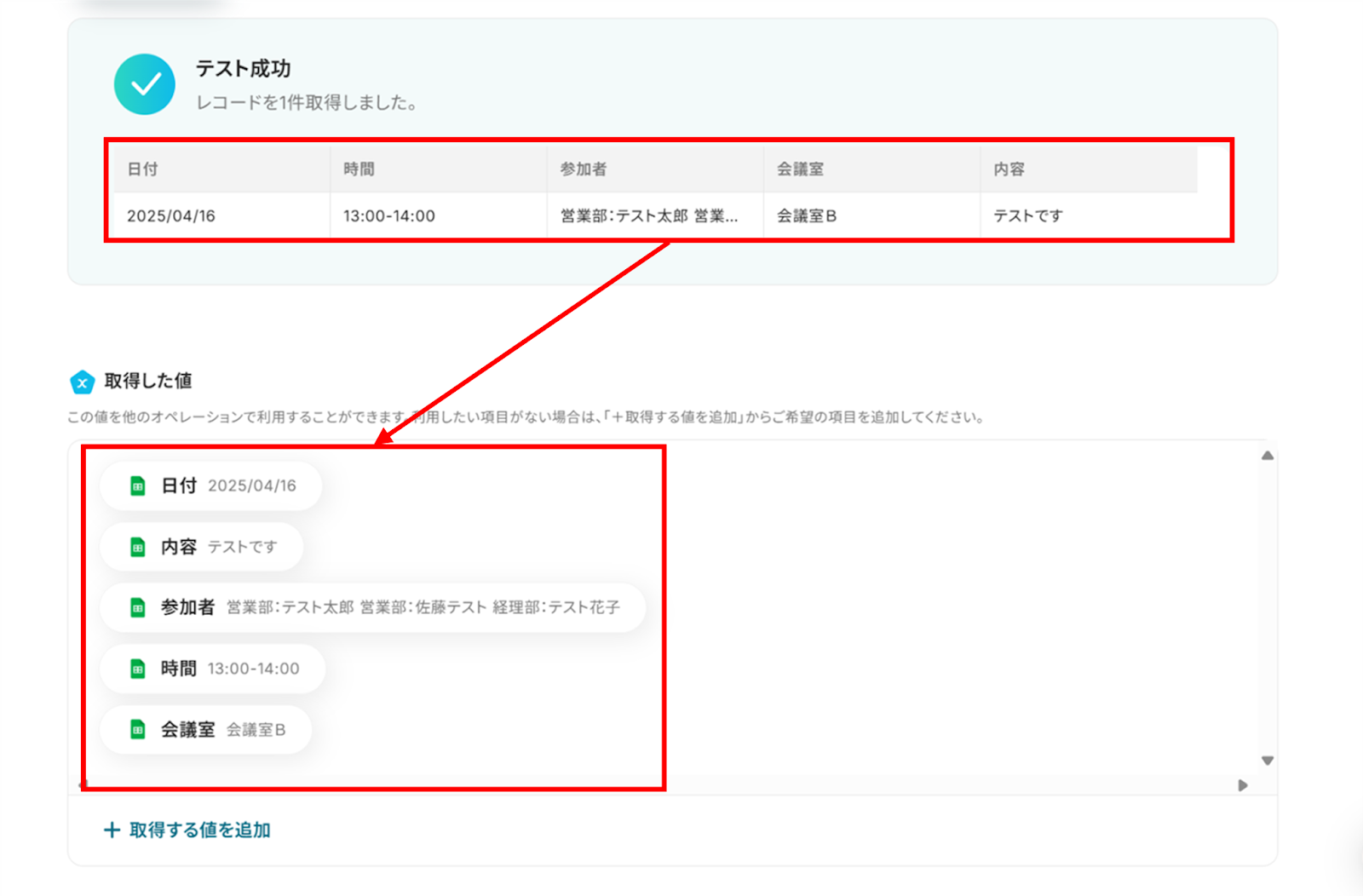 Google スプレッドシートの情報が「取得した値」に反映されればテスト成功です。