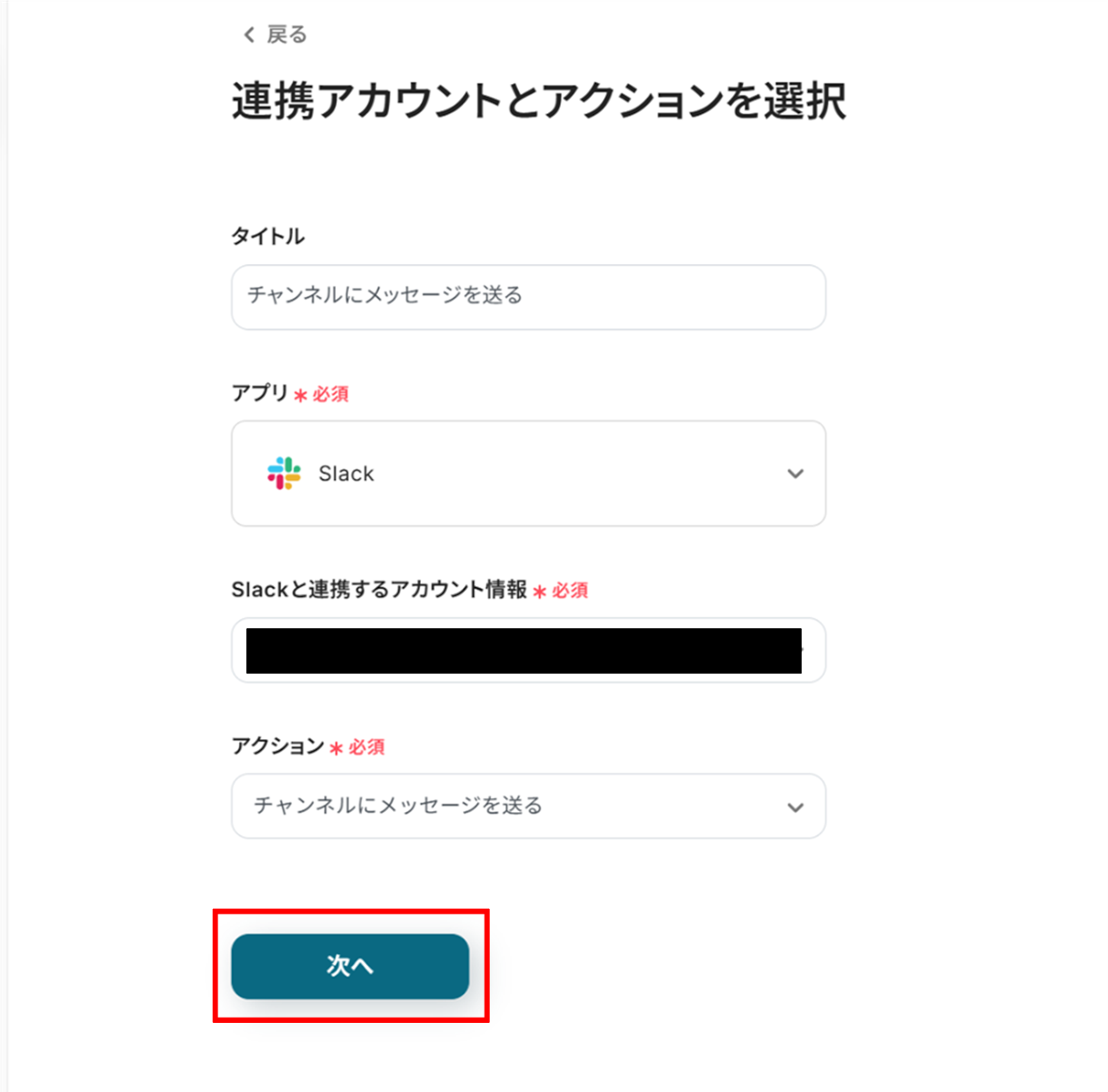 (2)Slackの「連携アカウントとアクションを選択」画面から、Slackと連携するアカウント情報に誤りがないかを確認し、アクションは「チャンネルにメッセージを送る」のままで「次へ」をクリックします。