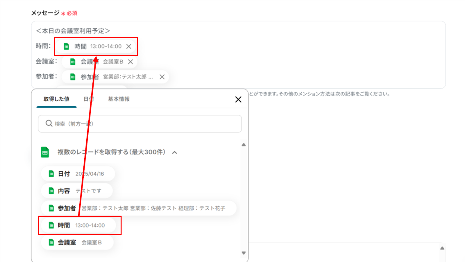 下へ進み、メッセージに先ほど取得した値を使って入力します。 文中に「取得した値」を使うことで、都度変更しなくても自動的に当日の内容に変更してくれますよ! 入力が完了したら、下部にある「テスト」をクリックし、エラーが発生しなければ「保存する」をクリックします。
