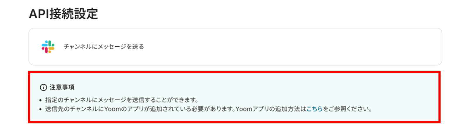 (3)「API接続設定」画面から赤枠の注意事項を確認し、先にSlackのチャンネルにYoomアプリをインストールしましょう!