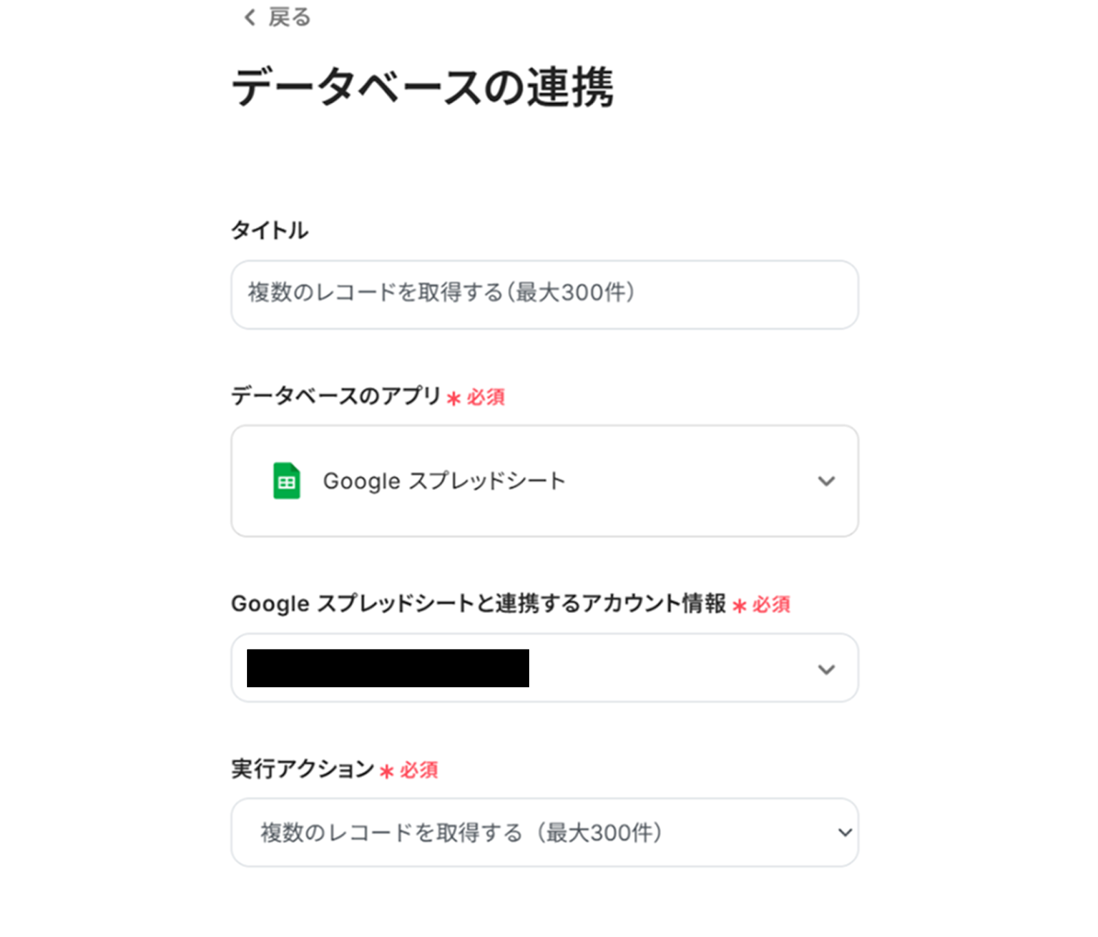 (2)「データベースの連携」画面から、Google スプレッドシートと連携するアカウント情報に誤りがないかを確認し、実行アクションは「複数のレコードを取得する(最大300件)」のままにします。