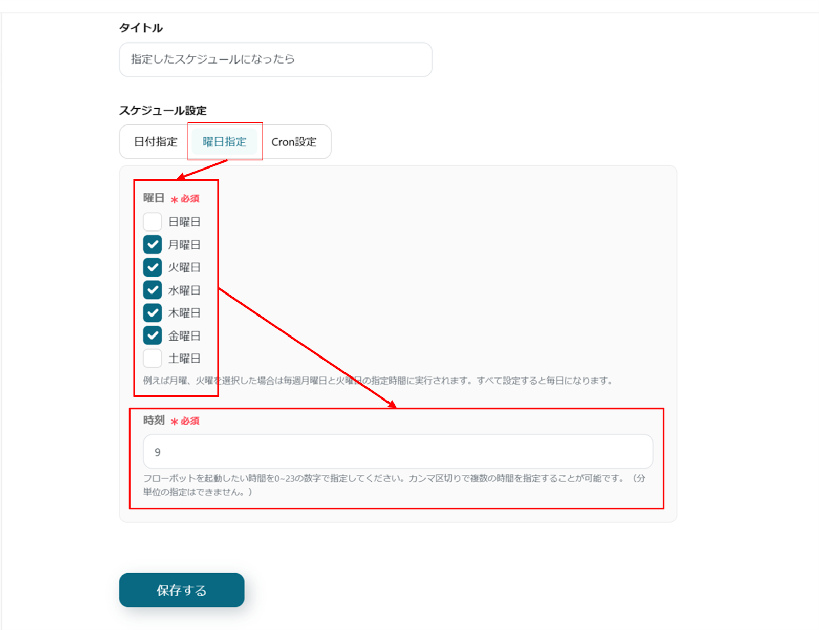 スケジュールトリガーの設定が完了したら、下部にある「保存する」をクリックします。