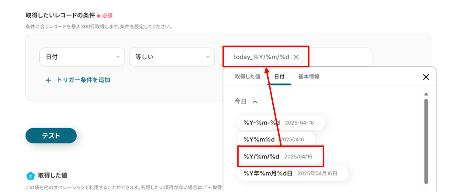 プルダウンから「日付」、「等しい」を選択し、下の画像のように{today_%Y/%m/%d}を入れることで、自動的に当日が指定されます。
