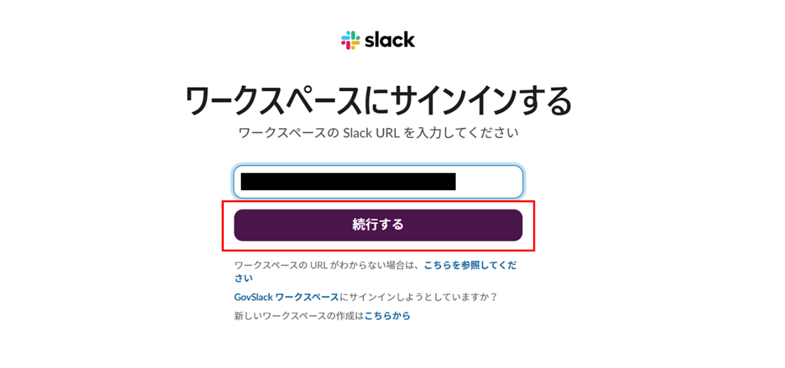 ワークスペースにサインインする画面が出てくるので、ワークスペースのSlackURLを入力し、「続行する」をクリックします。