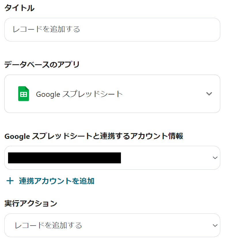 追加するレコードの値にはGoogleスプレッドシートのアウトプットを使用し、新たに作成するレコードの値を入力してください。