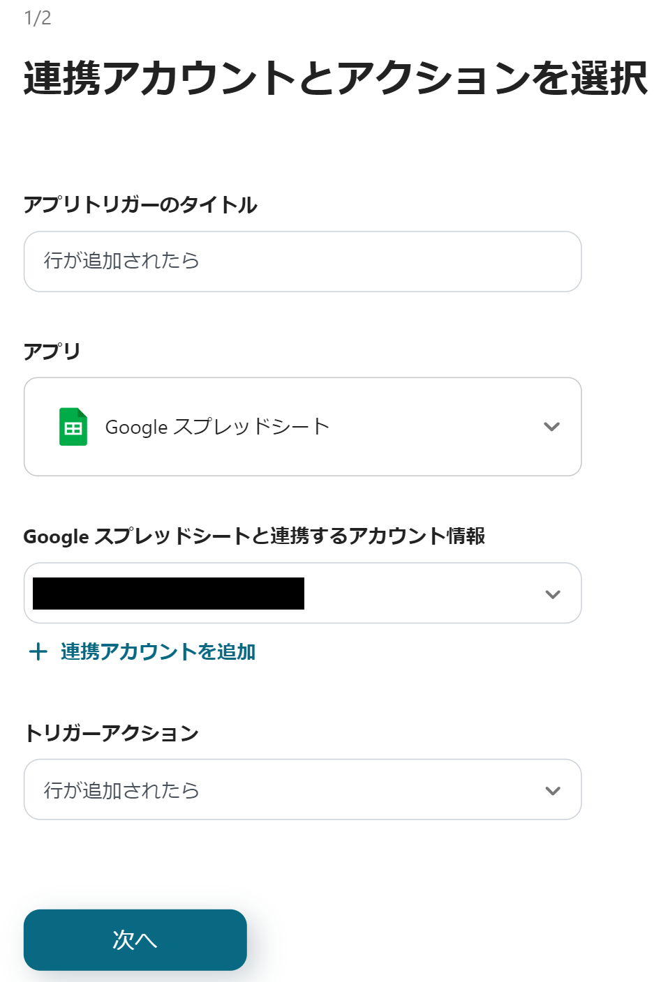 最初にGoogleスプレッドシートの設定から行うので、「行が追加されたら」をクリックしましょう。