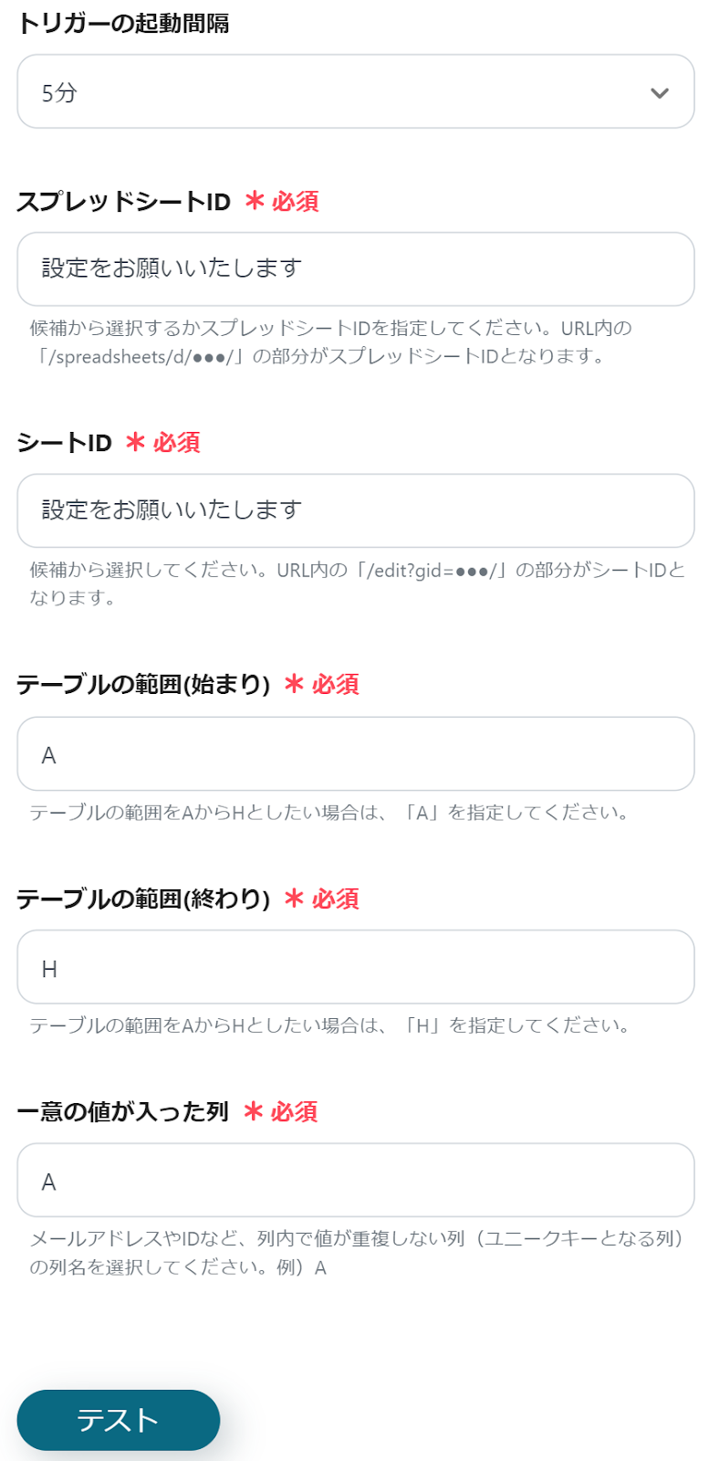 入力が終わったら、「テスト」→「テスト成功」→「保存」をクリックしてください。