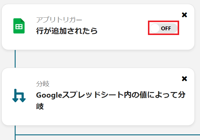Googleスプレッドシートのレコードが条件と一致する場合としない場合で分ける設定を行うので、「Googleスプレッドシート内の値によって分岐」をクリックしてください。