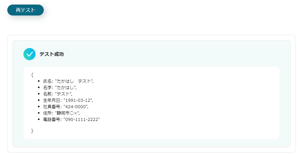 なお、テストではGoogleスプレッドシートの情報の2行目が取得されますが、実際のフローでは更新され行が取得されるようになっています。