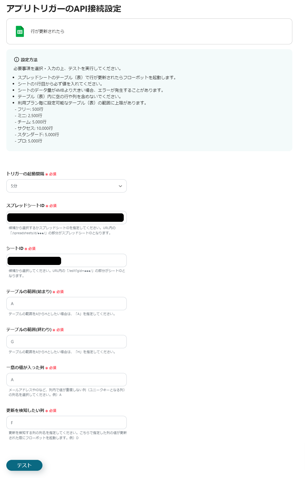 スプレッドシートIDなどの必須項目を入力したら「テスト」をクリックしてシートの情報を取得できているか確認してください。