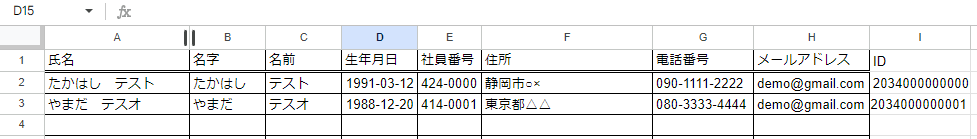 なお、即給の利用者情報を更新する場合、更新対象者を特定するための利用者番号が必要になります。そのため、あらかじめGoogleスプレッドシートで対象者の行に利用者番号が含まれている状態にしてください。