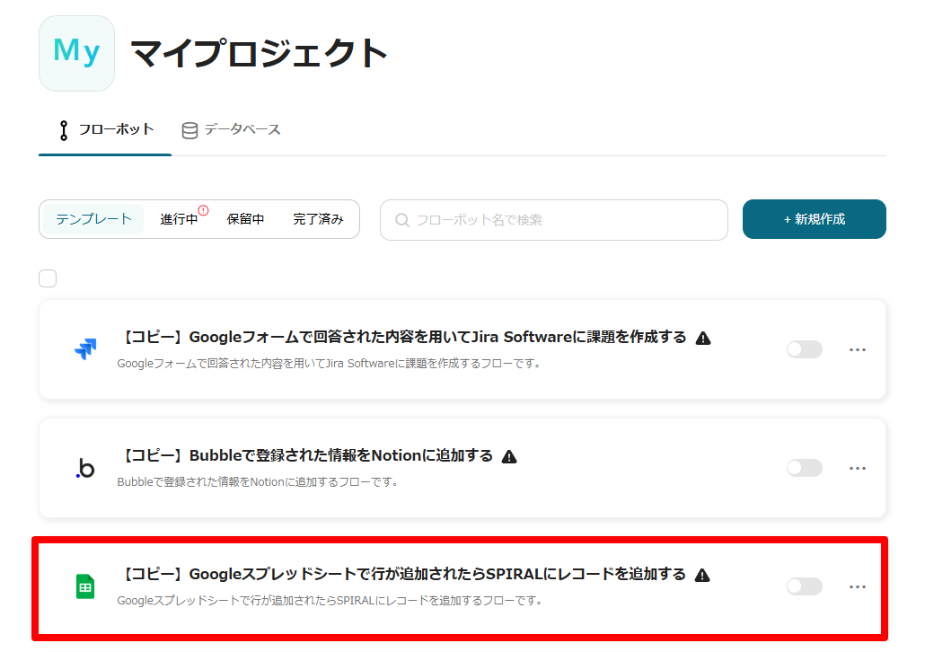 「【コピー】Googleスプレッドシートで行が追加されたらSPIRALにレコードを追加する」をクリックします。